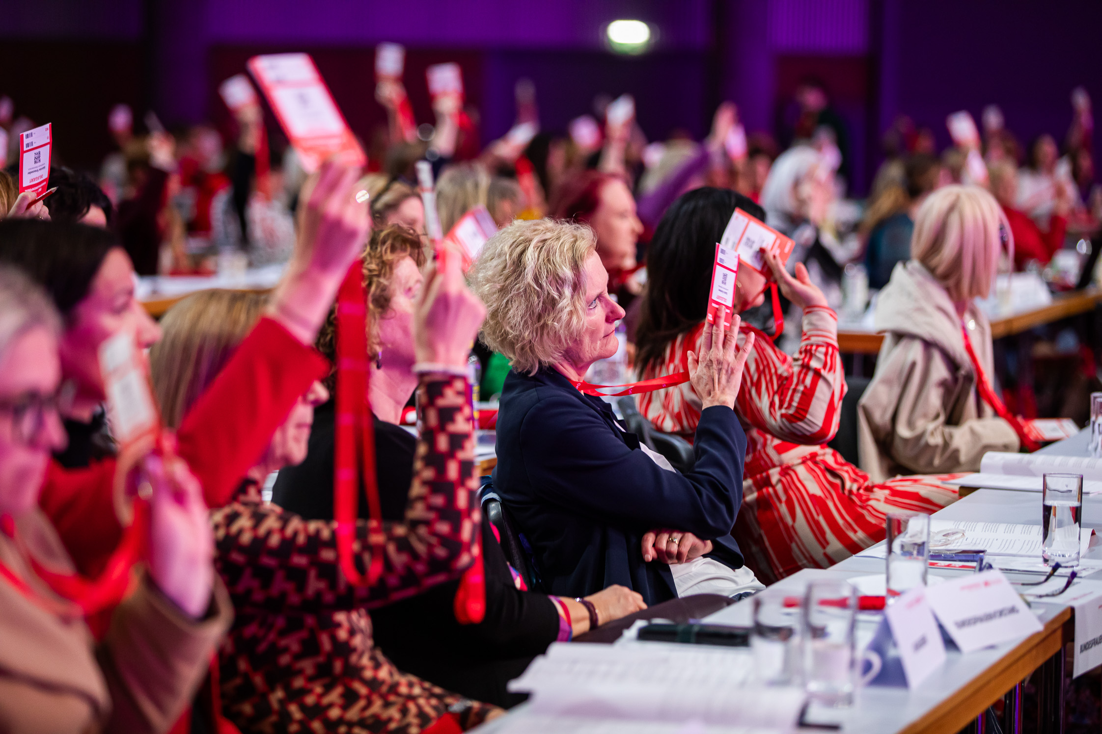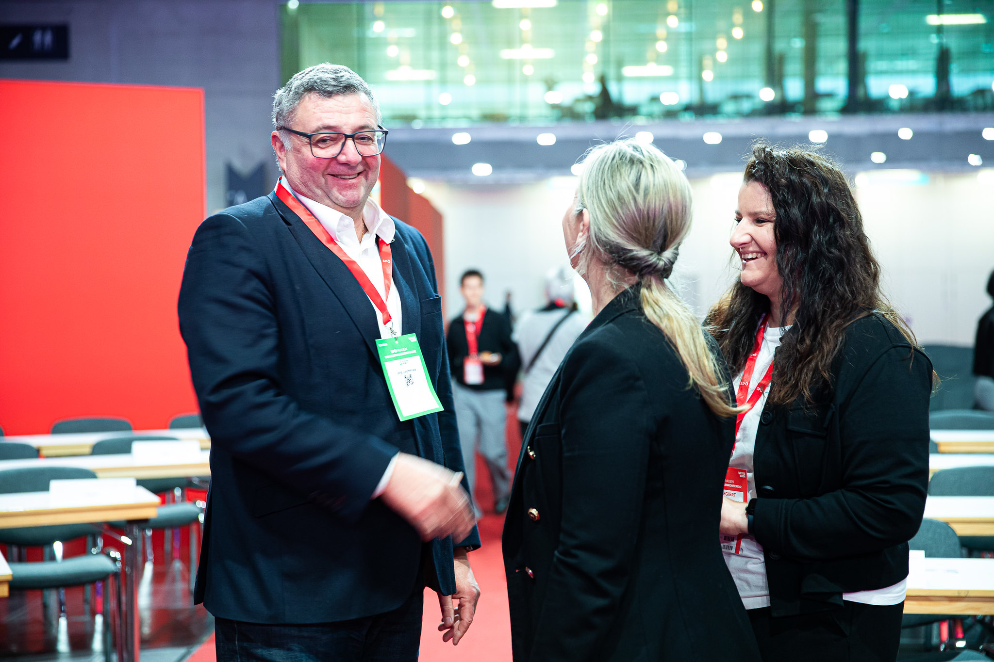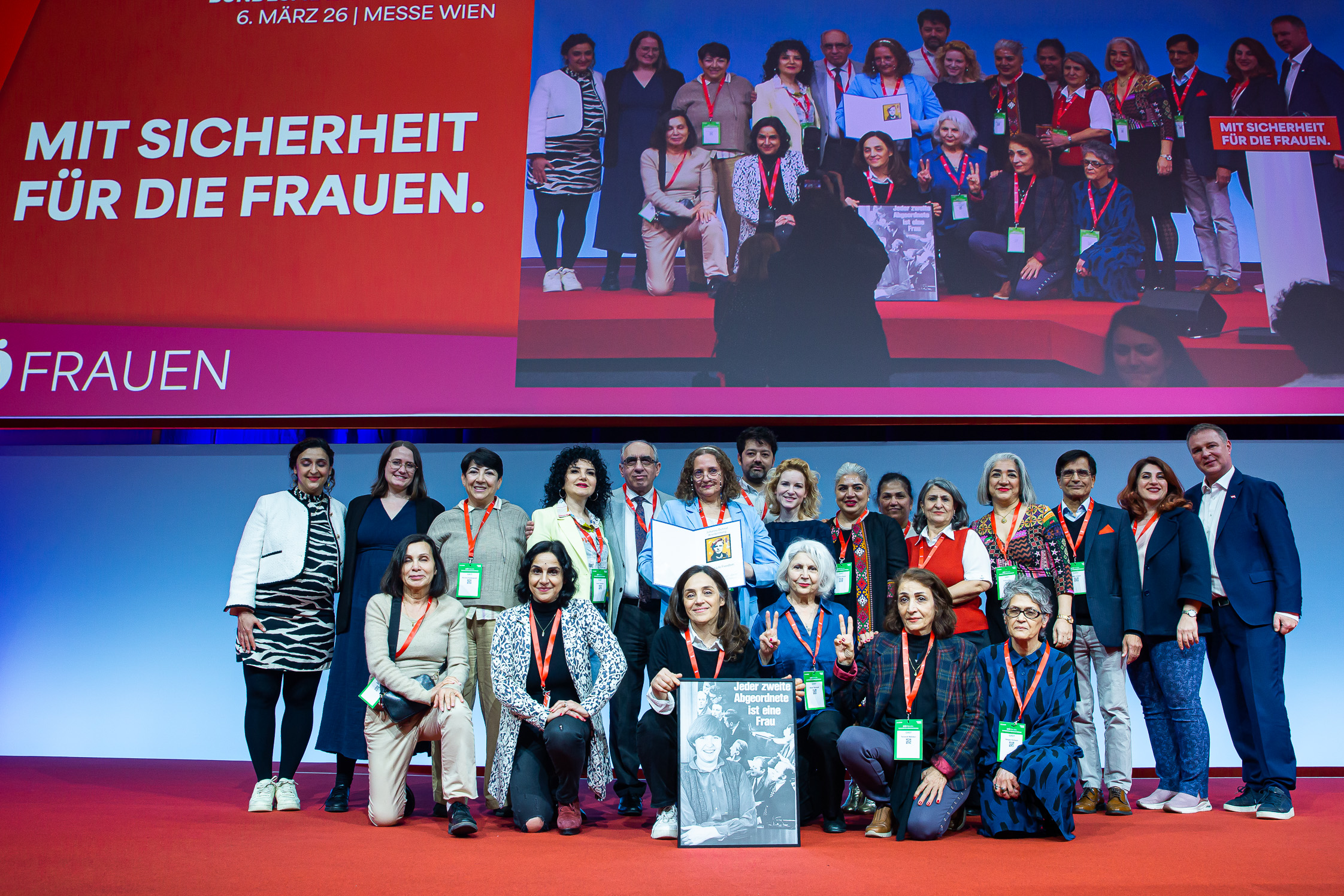 Rund 400 Delegierte und 200 Gäste sind am Freitag in die Messe Wien zur SPÖ-Bundesfrauenkonferenz gekommen. Darunter Finanzminister Markus Marterbauer und Staatssekretär Jörg Leichtfried, SPÖ-EU-Delegationsleiter Andreas Schieder und SPÖ-EU-Abgeordnete Evelyn Regner, SPÖ-Bundesgeschäftsführer Klaus Seltenheim, alle SPÖ-Landesfrauenvorsitzenden, Landesfrauengeschäftsführer*innen, stv. SPÖ-Klubvorsitzende Julia Herr, ÖGB-Frauenvorsitzende Christa Hörmann, FSG-Frauenvorsitzende Elfriede Schober, die Vorsitzende des Frauenrings Klaudia Frieben, Vertreter*innen von SJ, VSStÖ, JG und SoHo, die Bundesminister*innen a.D. Gabriele Heinisch-Hosek, Lore Hostasch und Hilde Hawlicek, Bundesrätin a.D. Irmtraut Karlsson und zahlreiche aktive und ehemalige Abgeordnete sowie Vertreter*innen aus den Bundesländern, Städten und Gemeinden und die Vorsitzenden der Konföderation der Kurden in Europa und kurdischer Frauen in Europa Faisa Younes und Jamila Amin.