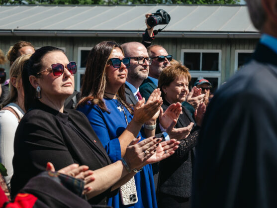 „Wir stehen heute alle hier vereint im Gedenken an die Opfer der grausamen Verbrechen der Nationalsozialistinnen und Nationalsozialisten. 80 Jahre nach Ende des Grauens. 80 Jahre nach Demütigung, Erniedrigung, Entrechtung, Verfolgung, Mord, Vernichtung und Völkermord. Wir stehen heute hier vereint mit der Verpflichtung nie zu vergessen und gedenken der Frauen und Männer und der Kinder, die in den Konzentrationslagern gequält, gefoltert und ermordet wurden.